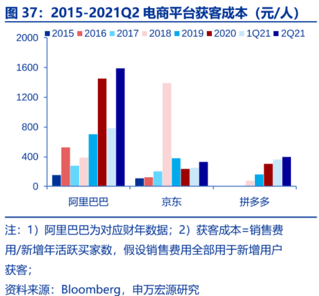 与此对应的,则是电商平台获客成本的急剧上涨。Bloomberg数据显示,自2020年以来,国内三大主要电商平台的获客成本都呈现急剧扩张趋势。