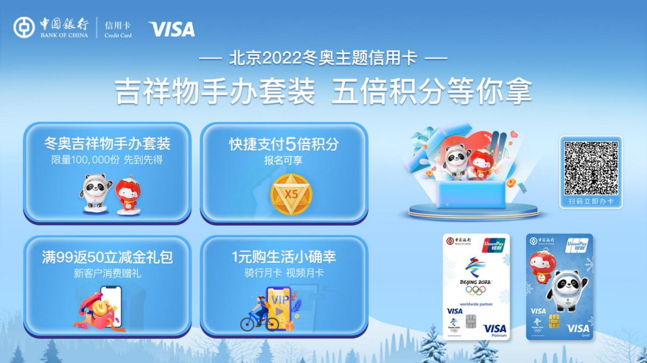 为支持北京冬季奥运会的举办,今年3月中国银行推出“北京2022冬奥主题信用卡”。卡面设计运用冬奥吉祥物、冬奥会徽等特色元素;卡片为芯片卡,同时拥有VISA、银联双标识;融合了冬奥场景、大众健身、缤纷生活及跨境消费等专属服务,一卡尽享境内外安全便捷支付体验。