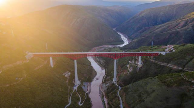 红色钢桁梁飞架在灰白的桥墩上,远处望去,跨越元江的中老铁路元江特大桥在群山间显得格外壮美。