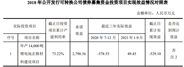 然而,上一轮融资投资锂电池项目却未能给光华科技带来好效益。界面新闻了解到,光华科技曾于2018年公开发行可转换公司债券,融资2.49亿元投资于年产1.4万吨锂电池正极材料建设项目,彼时其承诺效益是2798.36万元。但该项目累计实现效益却是-529.1万元。