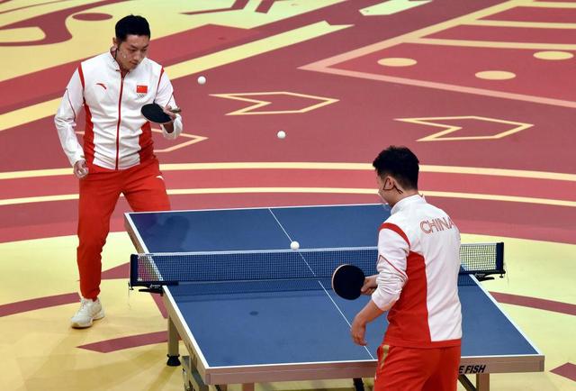 内地奥运健儿代表团成员许昕(左)、马龙在现场表演同时打三个乒乓球游戏。新华社记者卢炳辉摄