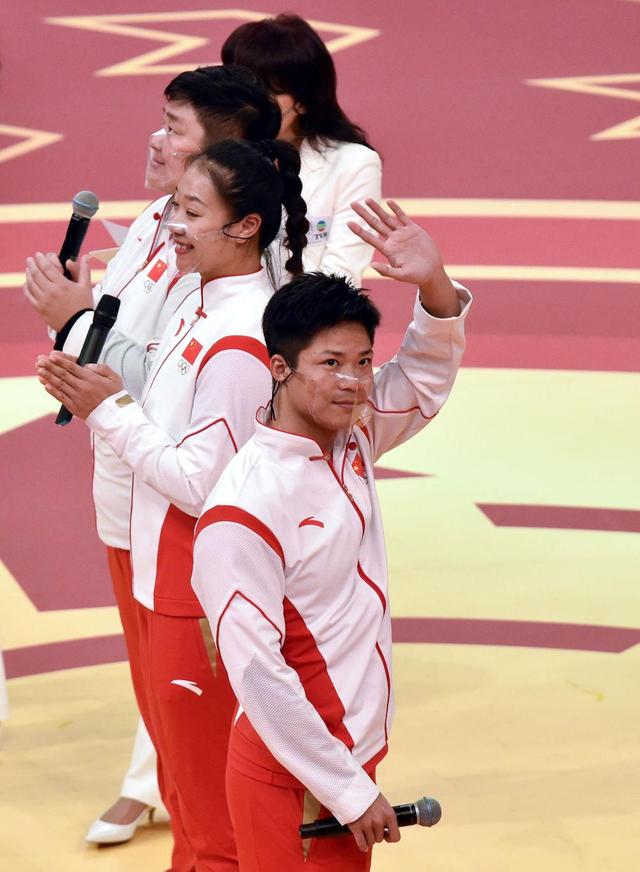 内地奥运健儿代表团成员李雯雯(右二)在汇演中与主持人互动。新华社记者贾浩成摄