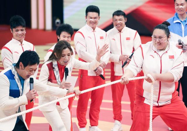 对女子举重奥运冠军李雯雯的挑战是拔河。主持人将绳子绕在自己腰上,用尽力气去拔,李雯雯却纹丝不动。等李雯雯发力时,两下就把主持人拽了过来,全场爆发出阵阵笑声。