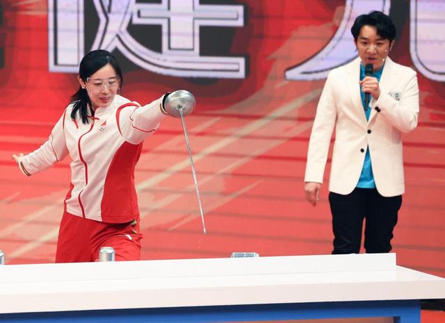 汇演为奥运健儿们设置了多个小游戏,对女子重剑奥运冠军孙一文的考验是“剑刺易拉罐”。面对挑战,孙一文笑着说“这也太简单了吧”。果然,“唰、唰、唰”,随着几道寒光,五个易拉罐应声倒下。