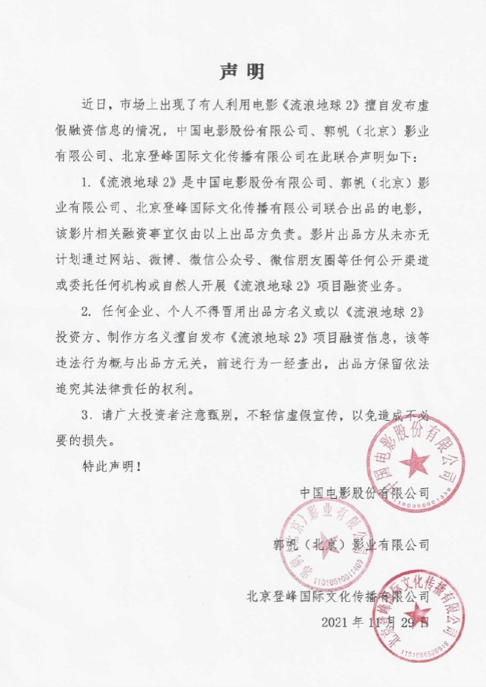 声明称,任何企业、个人不得冒用出品方名义或以《流浪地球2》投资方、制作方名义擅自发布《流浪地球2》项目融资信息,该等违法行为概与出品方无关,前述行为一经查出,出品方保留依法追究其法律责任的权利。