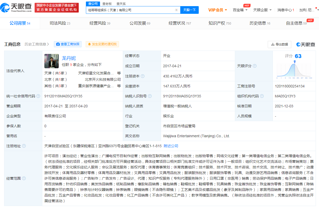 据天眼查App显示,近日,哇唧唧哇娱乐(天津)有限公司发生工商变更,经营范围新增日用口罩销售;互联网销售;化妆品批发;化妆品零售;化工产品销售等。该公司成立于2017年4月,法定代表人为龙丹妮,注册资本约430.42万人民币。