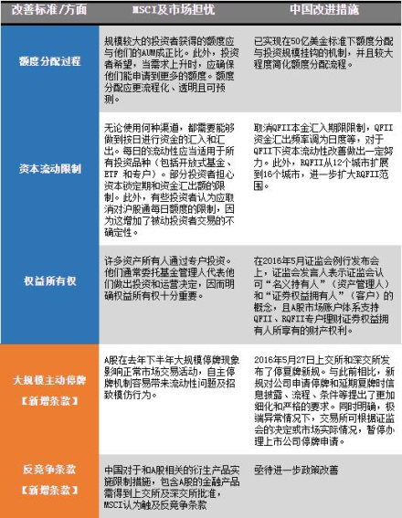 2016年4月,MSCI再次提出中国A股评估征询,在三类改善要求基础上,进一步提出A股公司停牌的任意性以及境外设立A股衍生产品限制等问题。