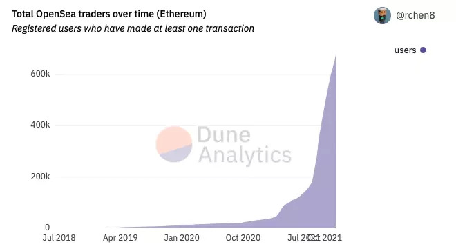 在当前全球NFT所有平台加起来交易账户已超过700万,仅OpenSea一个平台,就有超过60万交易用户;
