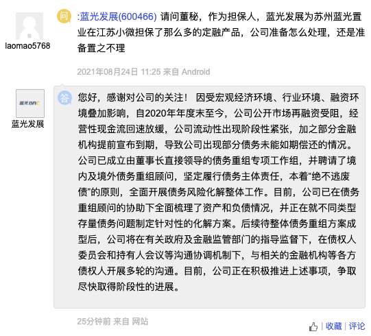 12月6日下午,蓝光发展在“上证e互动”平台回答投资者提问时称:因受宏观经济环境、行业环境、融资环境叠加影响,自2020年年度末至今,公司公开市场再融资受阻,经营性现金流回速放缓,公司流动性出现阶段性紧张,加之部分金融机构提前宣布到期,导致公司出现部分债务未能如期偿还的情况。公司已成立由董事长直接领导的债务重组专项工作组,并聘请了境内及境外债务重组顾问,坚定履行债务主体责任,本着“绝不逃废债”的原则,全面开展债务风险化解整体工作。目前,公司已在债务重组顾问的协助下全面梳理了资产和负债情况,并正在就不同类型存量债务问题制定针对性的化解方案。后续待整体债务重组方案成型后,公司将在有关政府及金融监管部门的指导监督下,在债权人委员会和持有人会议等沟通协调机制下,与相关的金融机构等各方债权人开展多轮的沟通。目前,公司正在积极推进上述事项,争取尽快取得阶段性的进展。