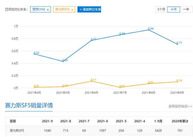 乘联会数据显示,4-10月,赛力斯SF5销量分别为129辆、204辆、1097辆、507辆、715辆、1117辆、1926辆,总计不足6000辆。