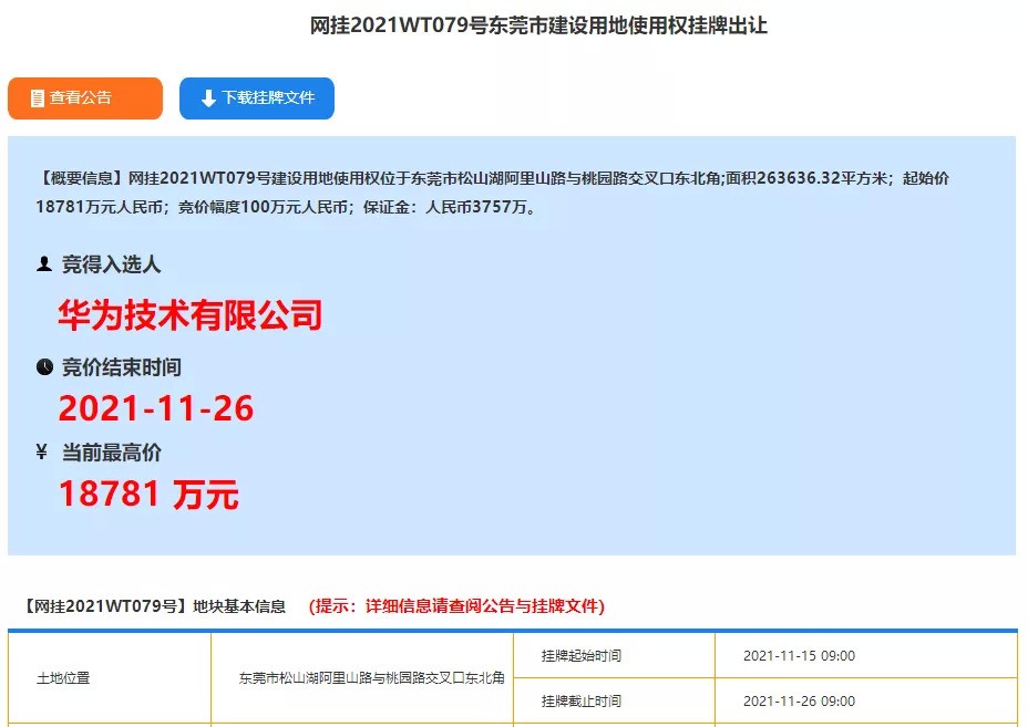 近日,华为以1.88亿元竞得东莞松山湖26万平方米工业用地,产业类型为智能汽车部件制造。