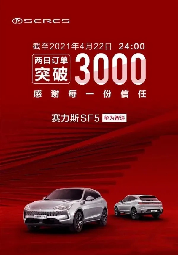 上市之初的赛力斯华为智选SF5,进入华为海量的线下体验店销售,并得到了余承东的“背书,因此火了一段时间,号称“两天订单破三千”、“一周订单破六千”。