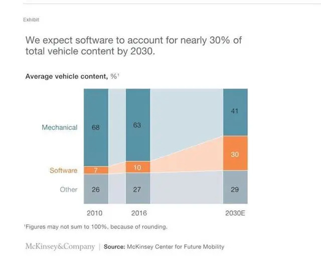 麦肯锡在2020年发布的一份报告中指出,目前汽车软件在大型乘用车的整车价值中占比为10%,未来预计将以每年11%的速度增长。