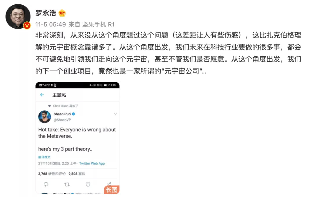 龙哥是罗永浩早年的外号之一,也是锤粉间的笑谈。矩阵直播间的扩张,加上罗永浩11月5日在微博透露出“我们的下一个创业项目是一家所谓的‘元宇宙公司’”的信号,罗永浩似乎准备开始探索其他领域。