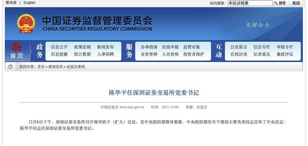 证监会网站消息,12月6日下午,深圳证券交易所召开领导班子(扩大)会议。受中央组织部领导委派,中央组织部有关干部局主要负责同志宣布了中央决定:陈华平同志任深圳证券交易所党委书记。