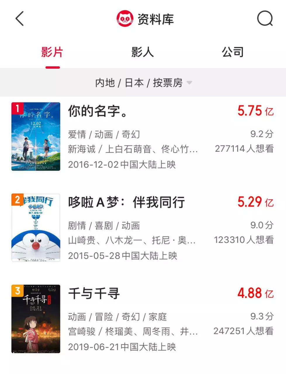 相比起来,日本引进片在中国战绩要优于韩国。日片在华的票房冠军是2016年引进的《你的名字。》,票房高达5.75亿,亚军为5.29亿的《哆啦A梦:伴我同行》,季军是重映的《千与千寻》,意外拿下了4.88亿的票房。值得一提的是,票房破亿的19部日本引进片均为动画电影。看来,日本动画IP在国内确实是块揽收票房的金字招牌。