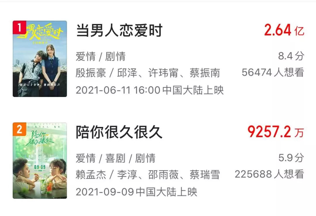 今年这两部引进片,再次印证了台湾爱情片的票房号召力。此前,《比悲伤更悲伤的故事》在2019年缔造了冷档期的票房神话,拿下近10亿的票房。2015年,演员名不见经传的《我的少女时代》拿下3.8亿的票房,还在内地捧红了王大陆。