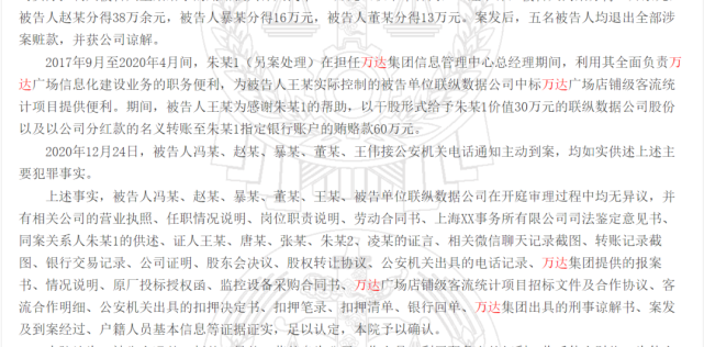 上述案件的文书显示,2017年9月至2020年4月间,朱某(另案处理)在担任万达集团信息管理中心总经理期间,利用其全面负责万达广场信息化建设业务的职务便利,为被告人王伟实际控制的联纵数据公司中标万达广场店铺级客流统计项目提供便利。