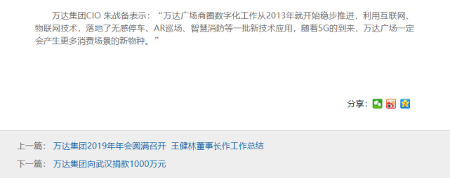 万达集团官网中,搜索“朱战备”可查询到22条相关信息。最近的为2020年1月22日《华为万达签订5G战略合作协议,全国率先推动5G商业场景应用》的新闻。朱战备为当时万达集团CIO。