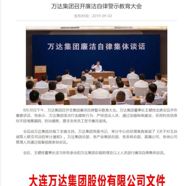 此次并非首次,万达高管受贿。2019年8月30日,万达集团发布了《关于对王焱斌等人移交司法的审计通报》。万达集团并于同日召开了全集团廉洁自律警示教育大会。