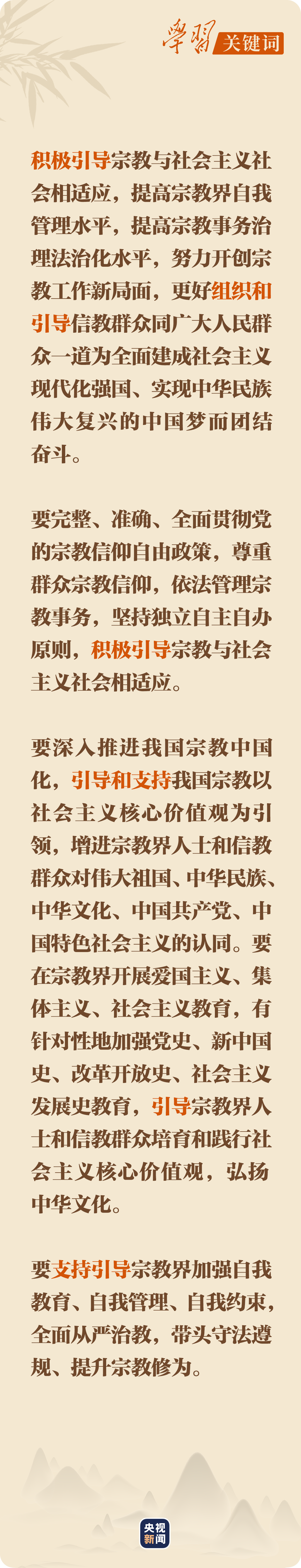 “要培养一支精通马克思主义宗教观、熟悉宗教工作、善于做信教群众工作的党政干部队伍,让他们深入学习马克思主义宗教观、党的宗教工作理论和方针政策、宗教知识,不断提升导的能力。”在此次全国宗教工作会议上,总书记全面总结宗教工作的成绩经验,深入分析宗教工作面临的形势任务,系统阐述了新时代宗教工作的新思想新理念新战略,就发挥“引导”在宗教工作中的重要作用作了明确部署。