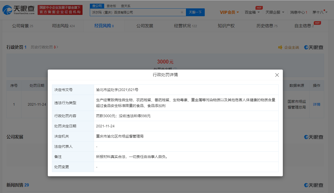天眼查APP显示,11月24日,沃尔玛(重庆)百货有限公司新增行政处罚信息,因其生产经营污染物质等含量超标的食品被罚款3000元,并没收违法所得598元,处罚单位为重庆市渝北区市场监督管理局。