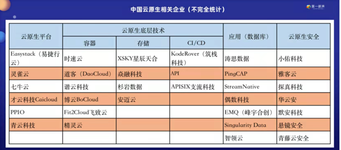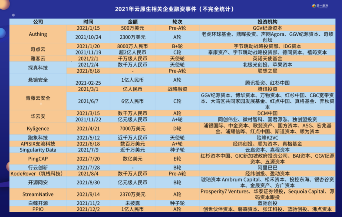 第一新声统计发现,云原生领域的诸多项目背后,都有着红杉中国、真格基金、九合创投、金沙江创投、源码资本等国内知名投资机构的身影。