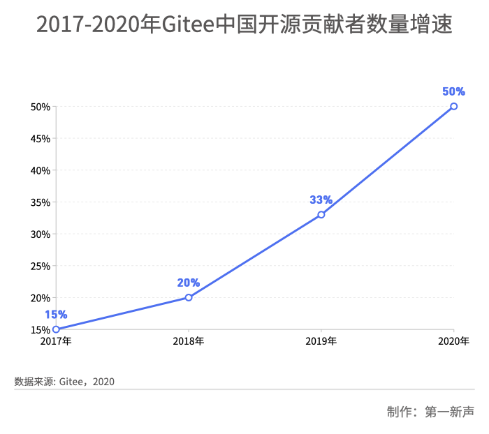 根据GitHub 2020年调研报告,中国在GitHub的贡献着数量增长迅速,目前仅次于美国,数量位居第二,并占据GitHub活跃贡献者中的14%。2020年,GitHub平台中国贡献者数量增长37%,增长速度为全球最快。另外,2020年在Gitee 平台上参与开源的贡献者增长了50%,达到600万。