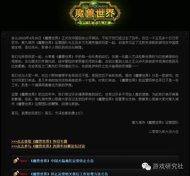 在此之前,所有玩家都知道了《魔兽世界》的代理权将从九城转移到网易手中的消息,期间颇多周折,数据服务能否顺利交接、新服务器的开放时间等都仍然悬而未决。虽然此前对九城(第九城市,以下简称九城)颇多苛责,但是当运营了四年《魔兽世界》中国区服务器的九城在官网发布公告与艾泽拉斯的勇士们告别时,在enya的《May It Be》的空灵歌声中,很多玩家不由感到怅然若失。