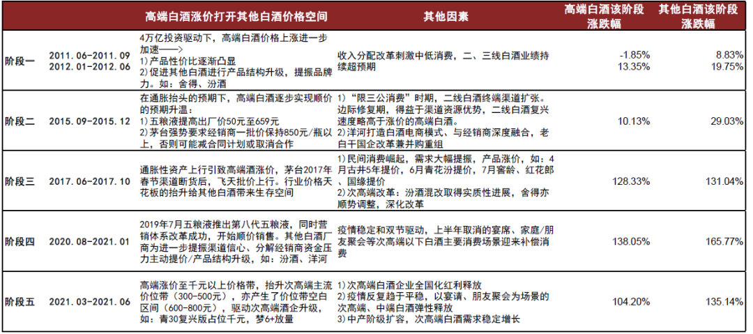 从历史来看,其他白酒周期略滞后于高端白酒周期。我们梳理了历史上5段其他白酒跑赢高端白酒时期,发现高端白酒在高景气下涨价效果明显,打开了其他白酒价格空间,因此景气度传导至其他白酒。