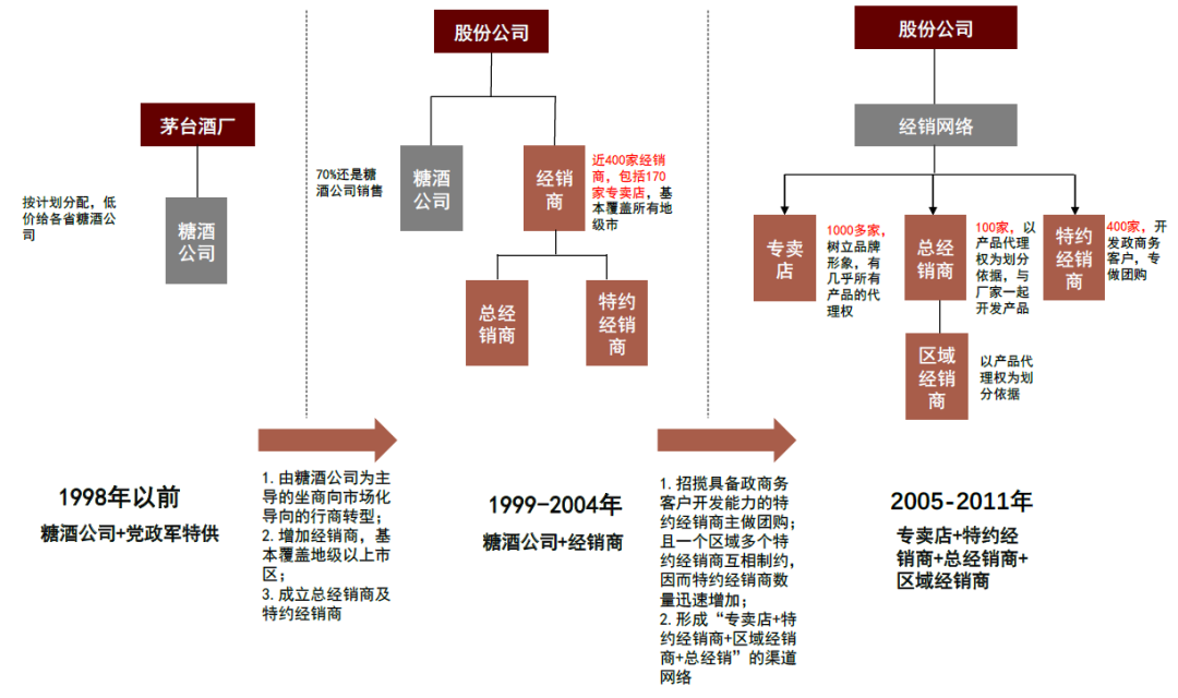 ►1)1998年,由完全依赖糖酒公司销售的坐商向主动开发市场的行商转变:1998年以前,茅台酒厂主要依靠糖酒公司进行销售,公司低价将茅台酒配额给各省糖酒公司,糖酒公司是“坐商”,客户提货都需要亲自上门。1998年行业面临金融危机和需求调整,当年7月茅台仅完成全年销售任务的30%。当时,茅台内部招聘第一批营销人员队伍17人,打破了完全依靠糖酒公司销售的惯例,开始逐步向市场化导向的行商改变,在剩下5个月内顺利完成全年销售任务。到2001年底,公司拥有394名经销商,包括170家专卖店,基本覆盖地级以上城市。