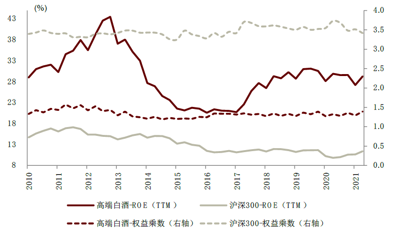 强品牌力可兑现为强盈利能力和充足的现金流,并给予投资者稳定的回报。高端酒企的强品牌力在表内主要体现为:1)高端酒企多采取先款后货的形式,应收账款占收入比例较低,合同负债占营收比例较高。2)盈利能力较强,高端酒毛利率较高,出厂单价超过500元/瓶的酒毛利率多在90%以上,成本上涨对利润影响十分有限,ROE多年维持在20%以上。3)白酒企业现金流较为充足,大规模融资需求较少,尤其是高端白酒分红比例自2015年后维持在50%以上,较高的现金储备和回款能力也提高了白酒企业抗风险能力。