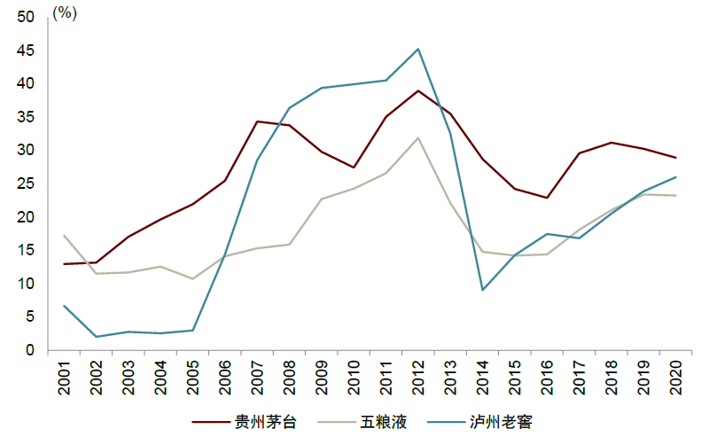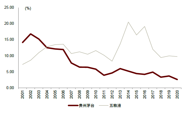 抢占核心意见领袖,强品牌力筑就核心护城河。90年代到21世纪初,在茅台还依靠不主动开拓市场的糖酒公司时,五粮液借助大商批发模式将产品大量铺货,成为行业中收入第一的酒企。21世纪初,茅台开始重点开发具有高端政务团购资源的特约经销商,抢占政务消费核心意见领袖;2005年后,随着这部分核心政务消费群体影响力增强,茅台的品牌力不断提升。2005年茅台酒(高端)收入超过五粮液,2006年成交价超过五粮液,2008年茅台出厂价首次超过五粮液,正式掌握了行业定价权,成为高端白酒第一品牌。茅台在2000-2003年间销售费用率高于五粮液,此后销售费用率持续下降;而与之相对,2006年之后,茅台与五粮液的批价差距持续扩大,这意味着茅台在较低营销投入的情况下实现了品牌力的持续提升。由于通过团购渠道培育的核心意见领袖进行口碑传播和消费者培育,茅台酒价格上涨与品牌力的提升互为正向促进,价格上涨使得消费者更加认识到茅台酒品牌力,并更愿意为其支付品牌溢价。目前,茅台酒不仅在销量上占据高端酒的市场的约50%,且在价格上与其他高端酒拉开数千元,品牌地位稳固。