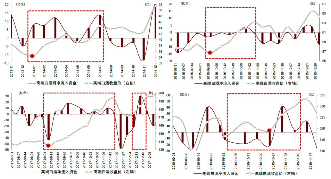 图表:伴随高端白酒资金净流入由负转正,高端白酒股价于2014.01、2015.09、2017.09、2019.10迎上行拐点