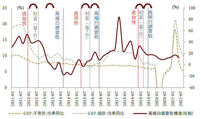 复盘历史,流动性边际转宽是高端白酒较长时间领涨整个白酒行业的信号,转宽的流动性通过财富效应拉动高端白酒消费。1)名义GDP相比实际GDP与高端白酒营收相关性更大,印证了流动性宽裕通过抬升名义收入(量)及资产价格(价)的路径拉动高端白酒消费。2)流动性边际宽松后,资金抱团优质资产效应加剧;同时,伴随财富总量增大,“茅五泸”估值性价比显现,因此资金更多流入高端白酒,高端白酒跑赢其他白酒。