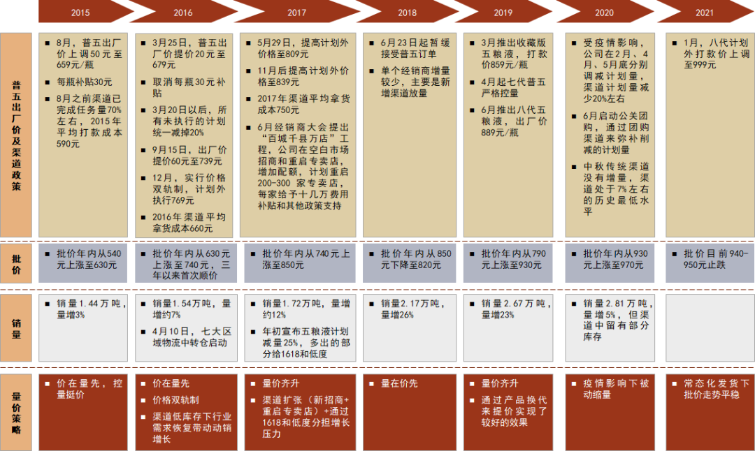 ►1)2016年底开始实行价格双轨制,计划外价格和计划外打款比例均可调节。2016年底公司开始实行价格双轨制,计划内出厂价739元,计划外打款价769元。此后公司不再直接提升普五的出厂价,而是主要通过调节计划外打款价来影响批价。公司分别于2017年5月、11月提升了七代普五的计划外价格,以及2021年的1月高了八代普五的计划外打款价。价格双轨制成效显著,2016年底公司自行业调整期以来首次实现顺价,经销商积极性逐步回归,也使得公司得以更灵活地调节价格。