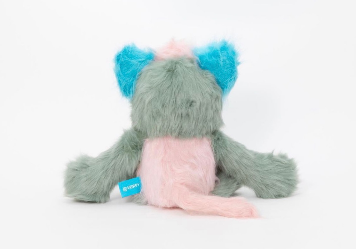 Visty的头部和四肢以温柔的鼠尾草绿构成,肚子、背部、尾巴和头顶的一撮毛则选择了靓丽的粉红色,再配上亮蓝色细节,整体配色活力又特别。玩偶的牙齿、略显坚硬锋利的爪子也让其兼具可爱与不羁个性,玩偶的背面还附有亮蓝色VERDY标签以彰显其身份。