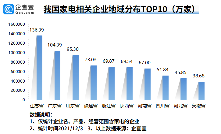 企查查数据显示,从区域分布来看,江苏以136.39万家家电相关企业排名第一,广东、山东分别有104.39万家、95.30万家家电相关企业,排在第二、三名。此后依次为福建省、浙江省、陕西省等。