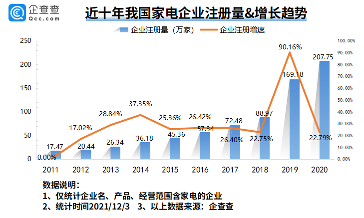 企查查数据显示,我国现存家电相关企业1135.83万家。近十年来,我国家电相关企业注册量逐年上升。2018年我国新增家电相关企业88.97万家,同比增长22.75%。2019年新增169.18万家,同比增长90.16%,是近十年增速最快的一年。2020年新增207.75万家,同比增长22.79%,是近十年新增最多的一年。