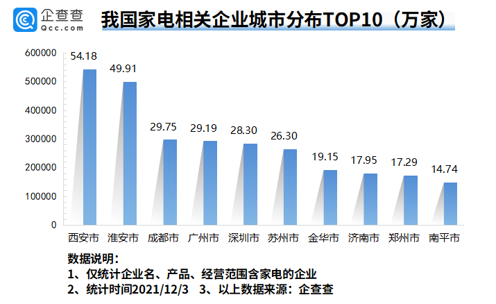 企查查数据显示,从城市分布来看,西安位居榜首,有54.18万家家电相关企业。淮安、成都分别有家电相关企业49.91万家、29.75万家,排名前三。此后依次为广州、深圳、苏州等城市。