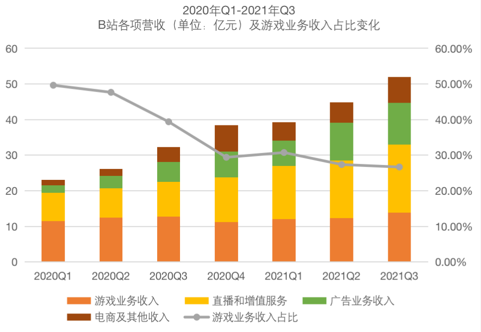 而在这些年的发展中,B站的营收结构经历了两个阶段的变化:第一阶段是2019年之前的“《FGO》时代”,游戏业务收入几乎是B站主要的收入来源;2020年第一季度开始,游戏业务收入在总营收的占比逐步降低,到了2021年第三季度已经降至26.7%。