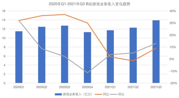 但问题在于,和其他业务的高速增长相比,游戏业务几乎是在走下坡路。尤其是2020年开始,游戏业务在同比和环比的指标上都出现了不同程度的下降。