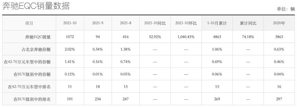 根据搜狐汽车统计的销量数据,今年10月EQC销量为1072台,而8月和9月,这款车的销量惨淡,仅为416台和94台。