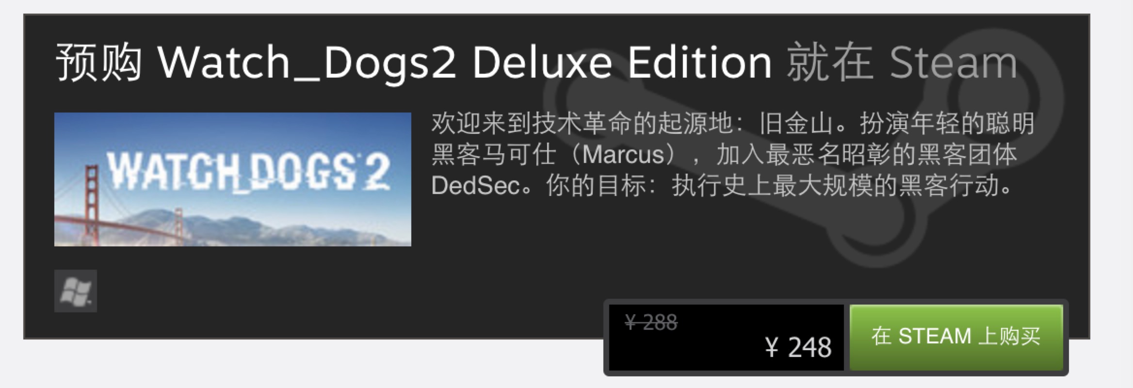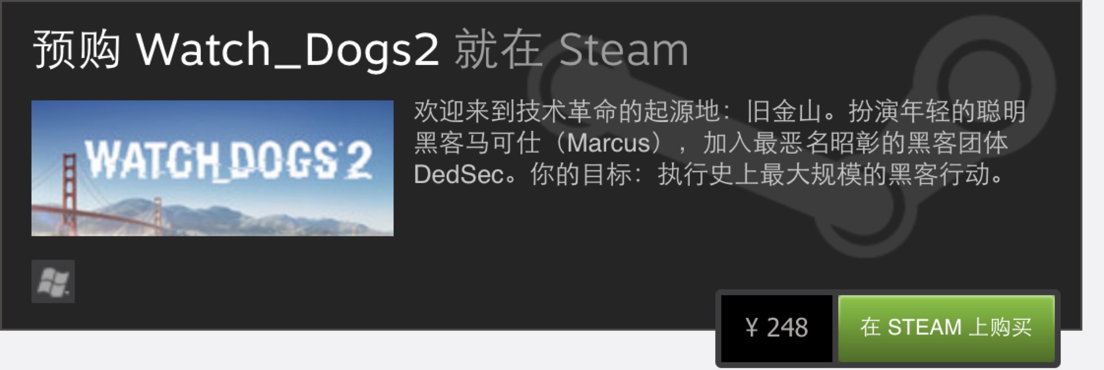 目前《看门狗2》已经正式上架steam,国区售价248元。虽然要等到11月16日《看门狗2》才会解锁,不过这部游戏已经可以开始预购。《看门狗2》普通版248元并未打折,不过其豪华版原价为288元,预购期间价格仅为248元和普通版一样,《看门狗2》黄金版售价408元,折后价368元。