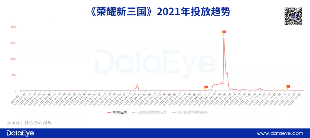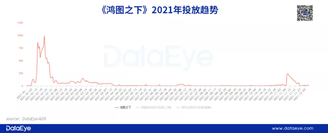 腾讯在投放策略上走出了“独立行情”,选择在特定时间段以“一波流”的形式做投放,如《鸿图之下》选择在21年初集中投放,《乱世王者》则在Q4集中投放,今年推出的《荣耀新三国》在游戏上线时集中投放,其余时间相关产品的效果投放几乎不进行。