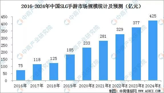 SLG市场规模稳步提升。根据中商产业研究院数据显示,2019年中国SLG手游市场规模达到185亿,占比整个手游市场规模的10.5%。无论市场规模还是市场占比,SLG手游都呈现出稳步提升的状态。而且相关数据预估在2024年,国内SLG市场规模将突破400亿。
