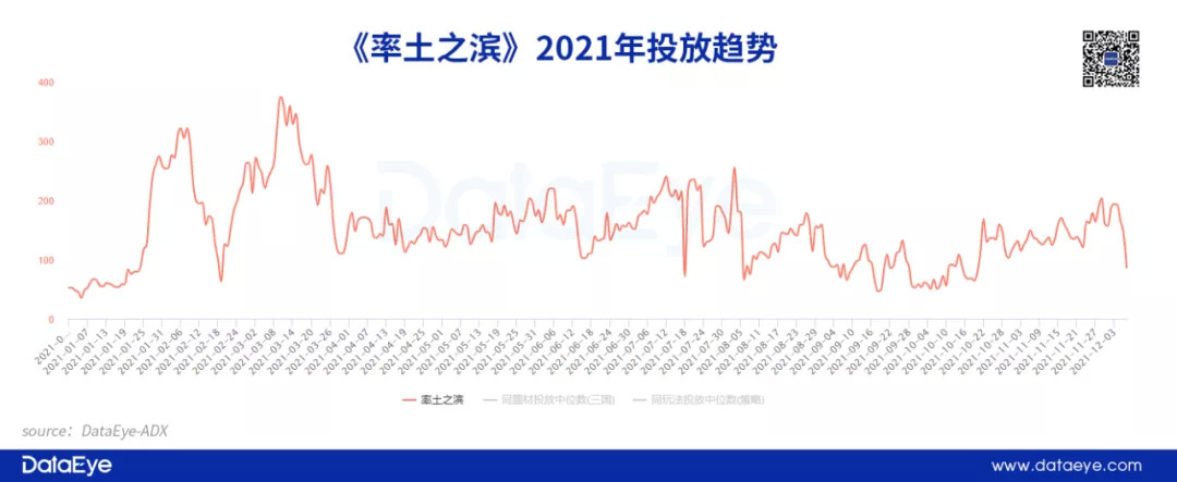 与之对比的是,运营时间长达六年的《率土之滨》,效果广告投放已经成为非必要的选择,但依然需要稳定的广告投放实现“拉新”与“唤醒”等运营工作。因此我们可以看到《率土之滨》整体投放量并不高,波动也不大,投放策略愈发稳健。