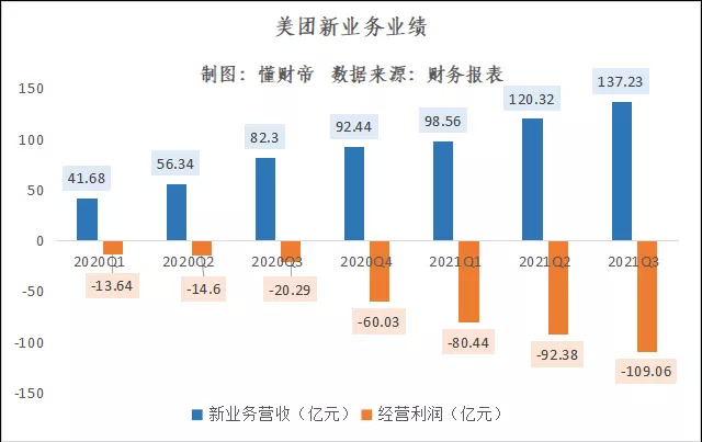 2021Q3财报显示,报告期内,在零售业务以及共享骑行服务增长带动下,新业务及其他板块实现营收137.23亿元,同比增长66.7%,但经营亏损规模却同比扩大了437.5%,至亏损109.06亿元。受此影响,11月29日港股开盘后,美团股价跌超8%。