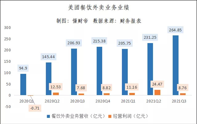 受益于整体交易规模的攀升,美团餐饮外卖业务实现营收264.85亿元,同比增长28%,经营利润为8.76亿元,同比增长14%。