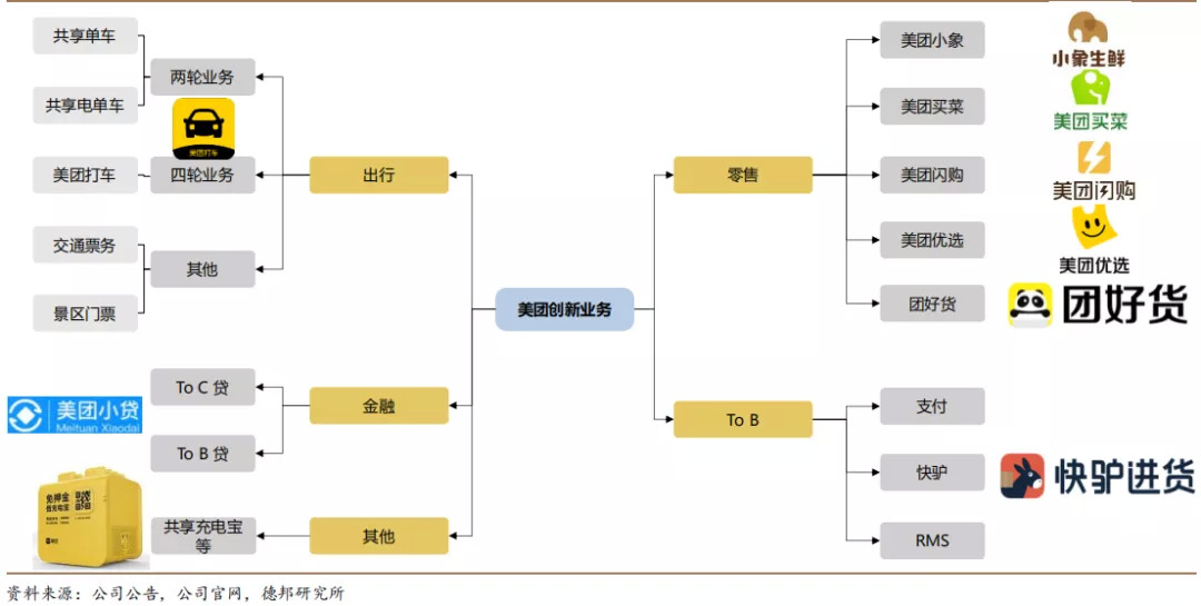 据德邦证券发布的研究报告,目前,美团创新业务分为(1)零售:美团买菜、美团优选、美团闪购、团好货等;(2)出行:共享单车、美团打车等;(3)To B:快驴进货、聚合支付等;(4)金融:美团小贷等;(5)其他:共享充电宝等。
